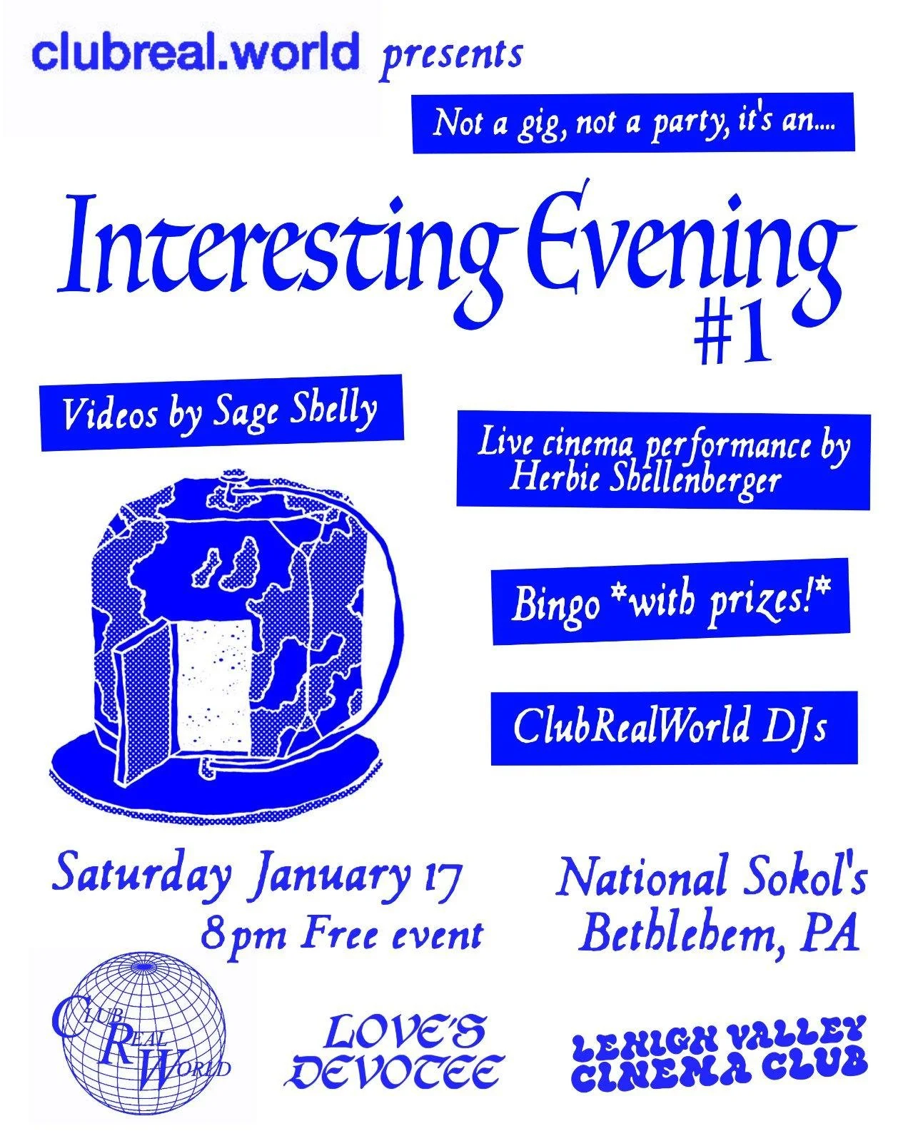 This event is the first of many shows, hangs, and happenings from a new collaborative we (or I, Charlie) have joined. It’s called Club Real World. It’s a new venture meant to add to an already active scene of artists, musicians, and food makers; showcase them and/or hoping to bolster a sense of inspiration for folks around here- to continue making things, performing, etc. Further, we recognize our proximity to nearby locales like Philly, NYC, and other regional creative hubs and will be leveraging this to expand our creative connections, communities, communications, and transmissions ;-)